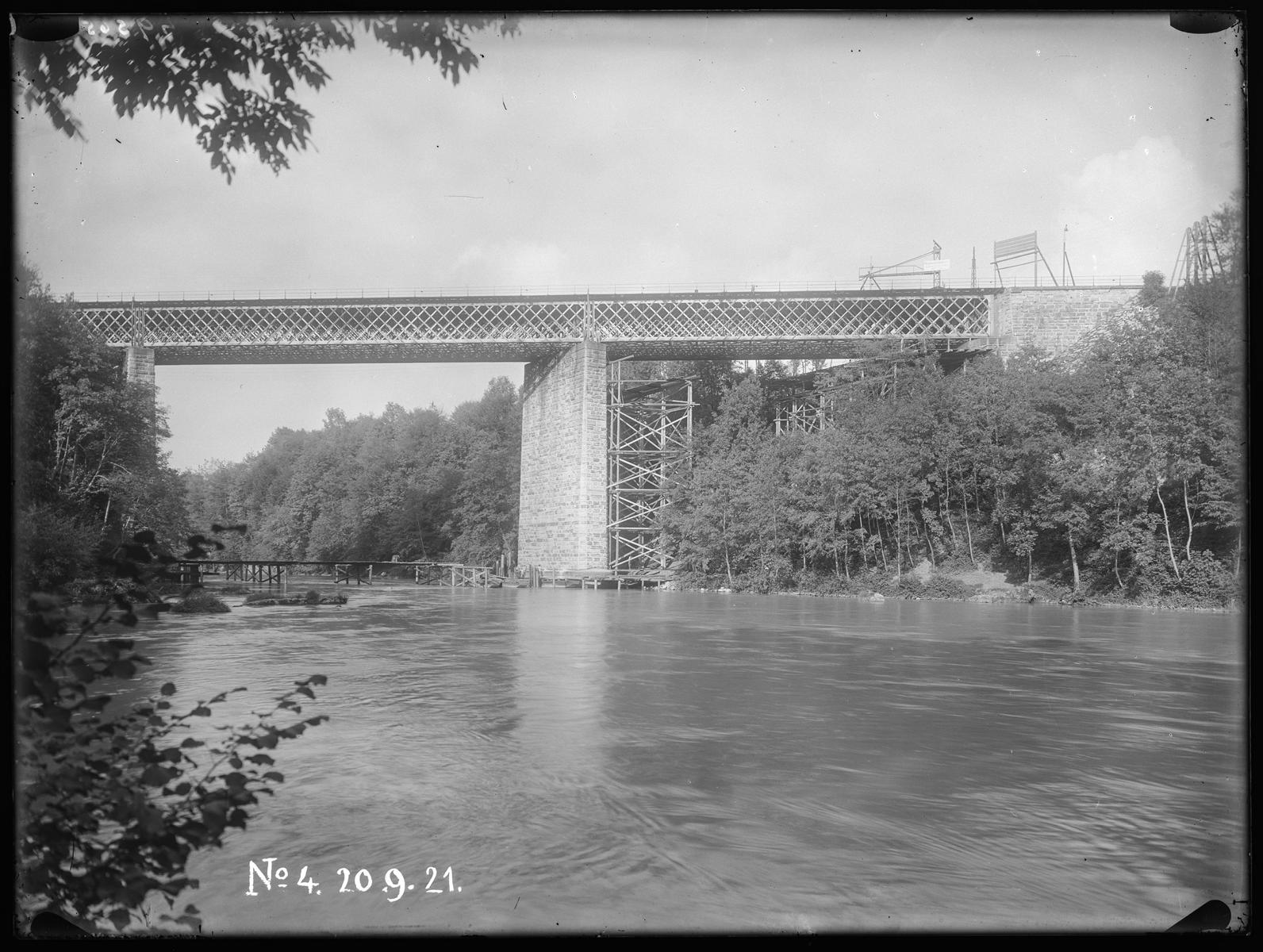 Auf einem Lehrgerüst neben der bestehenden dreigleisigen Brücke wurde die neue Eisenkonstruktion montiert und später zwischen die alten Widerlager eingeschoben. Das Verschieben von rund 1200 Tonnen Eisen bedeutete damals die grösste Brückenverschiebung der Schweiz.