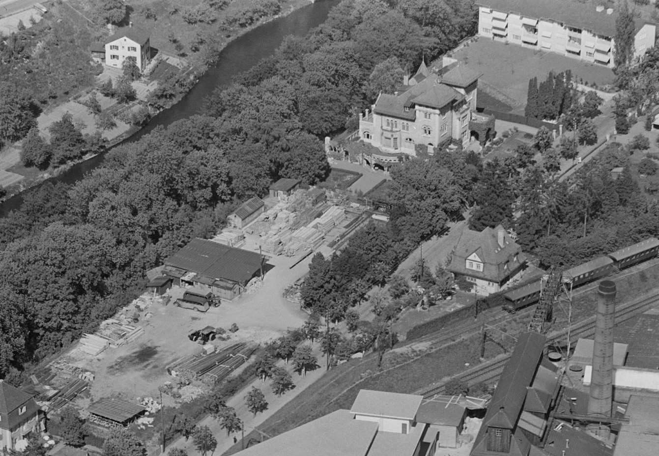 Die Römerburg im Mai 1954. Die Parkanlage ist zerstört, der Platz als Depot einer Baufirma genutzt. In der östlichsten Ecke wurde bereits ein Mehrfamilienhaus erstellt. StaB Suter Q.04.2.691.