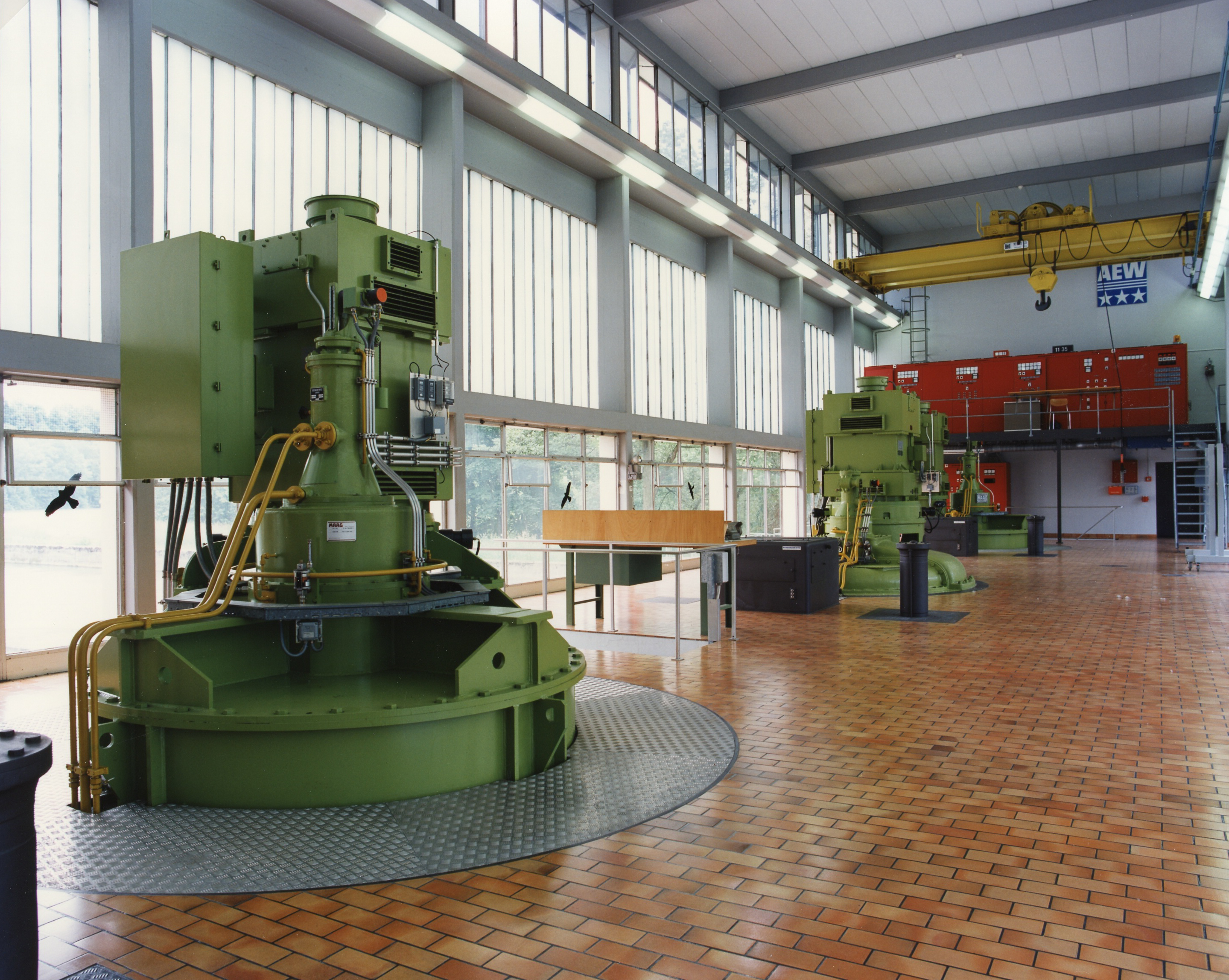 1960, Bau des heutigen Kraftwerks durch die Basler Architekten Suter & Suter, Montage der Maschinengruppen 1 und 3 beidseits der Turbine von 1933. Leistung rund 2.6 MW