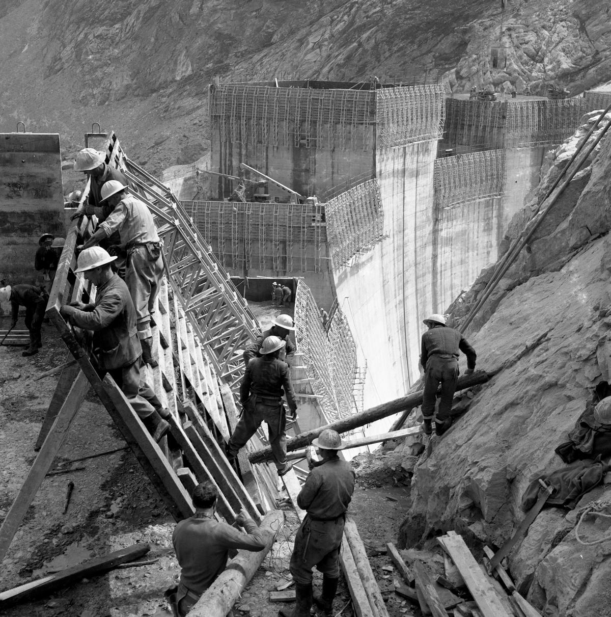 1950, Beginn der Beteiligung an grossen alpinen Speicherkraftwerken wie Grande Dixence, Maggia, Hinter- und Vorderrhein